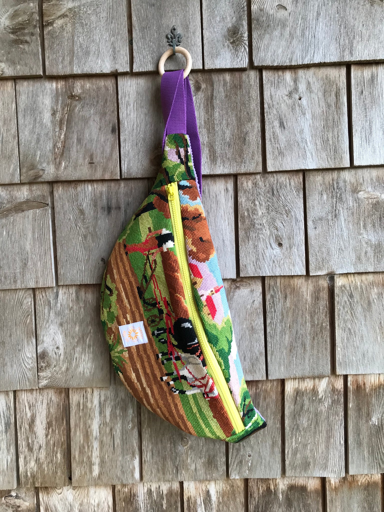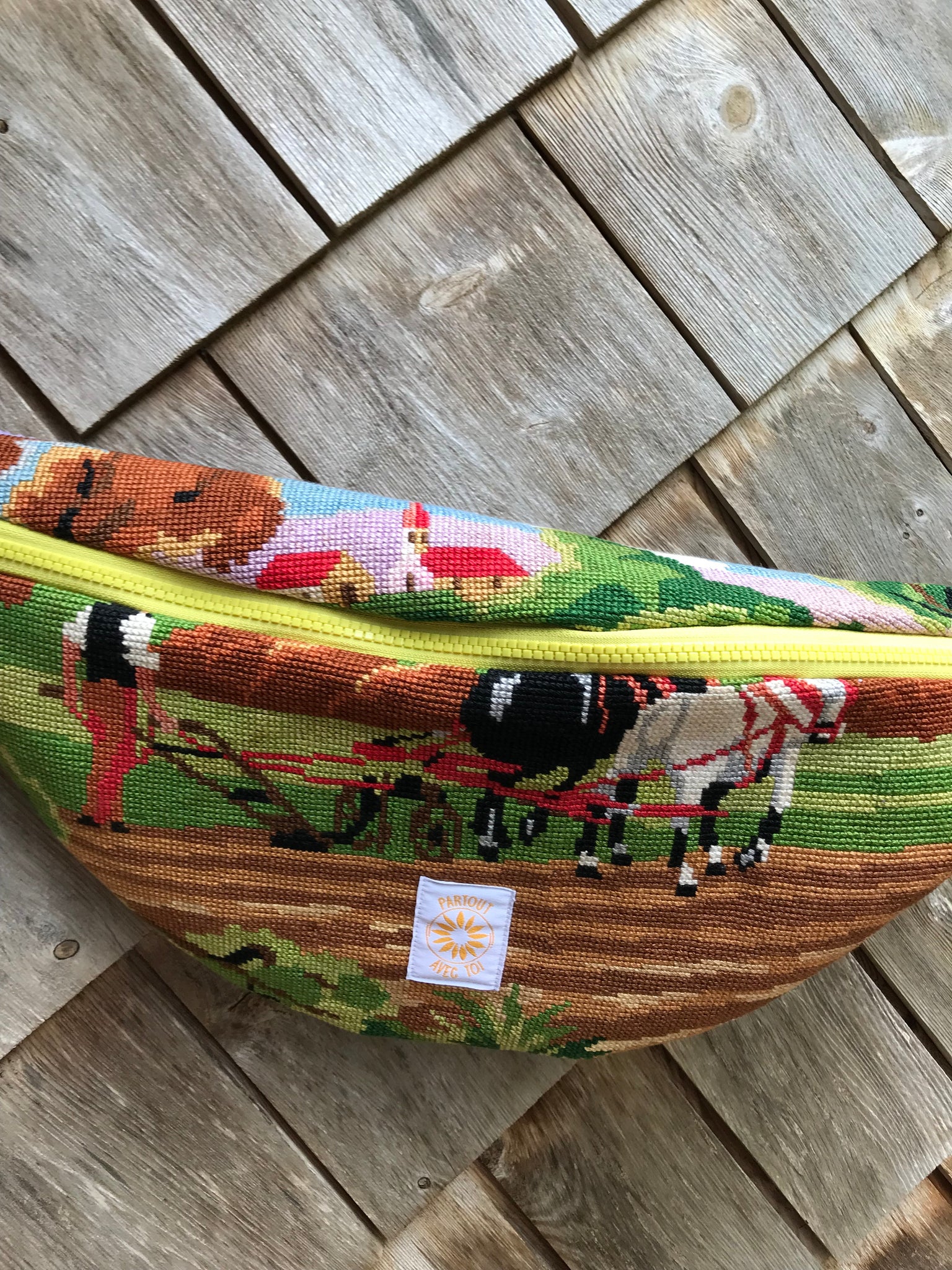 Grande banane en canevas (broderie chinée, réalisée à ma main). l’arrière est en velours.
