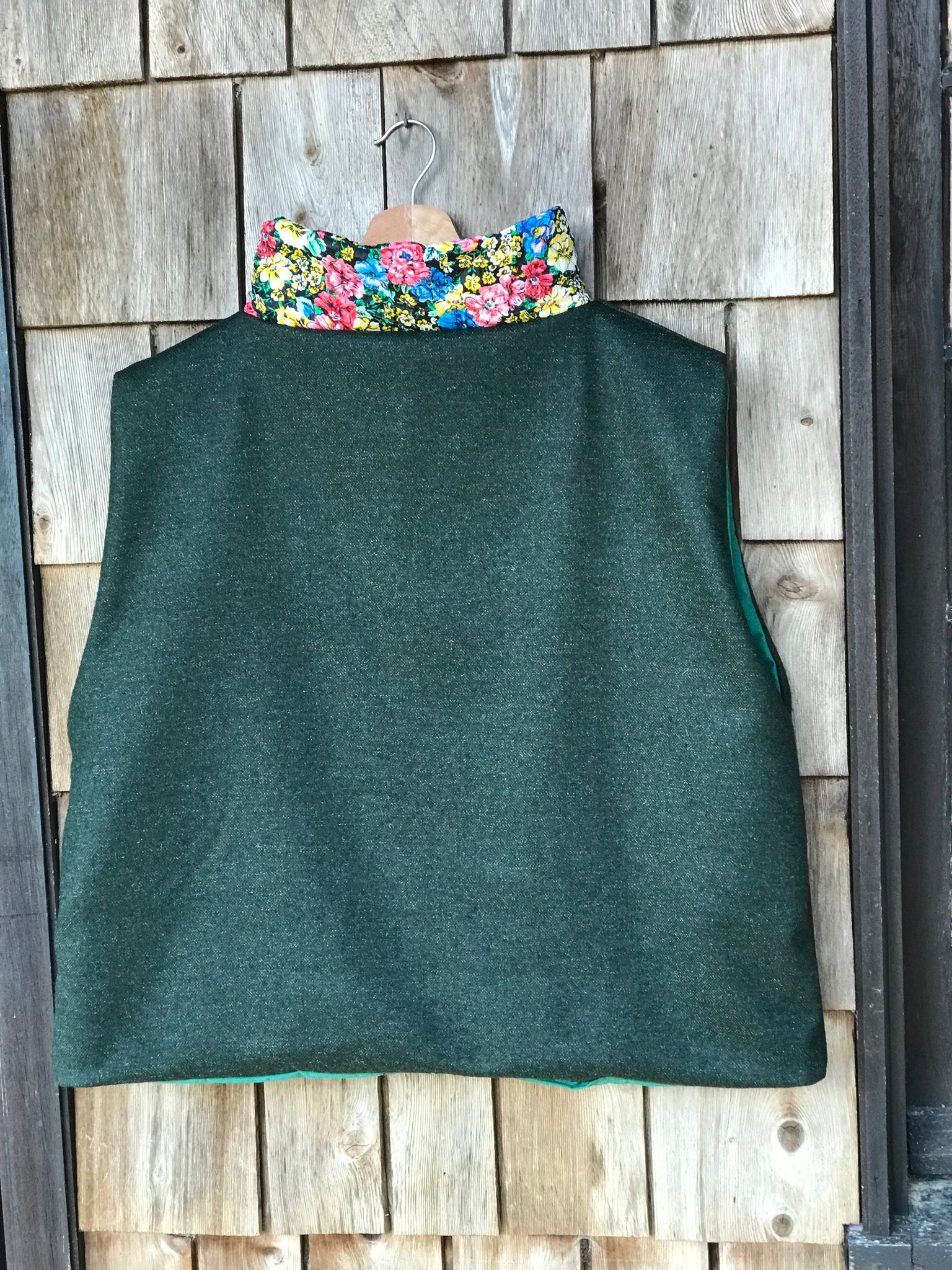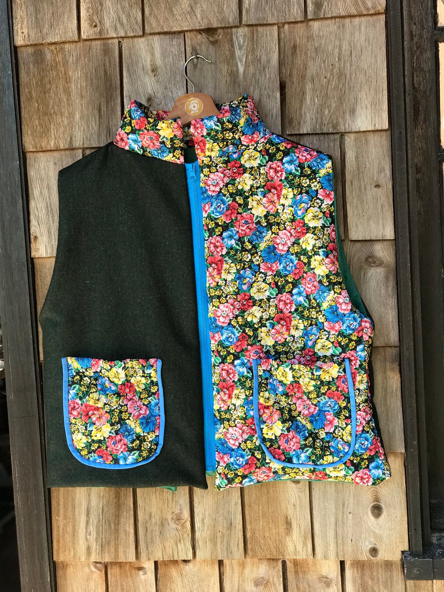 Gilet sans manche réalisé à partir de tissus vintage revalorisés. Le tissu à fleurs matelassé était une robe de chambre et le tissu kaki est un lainage vintage