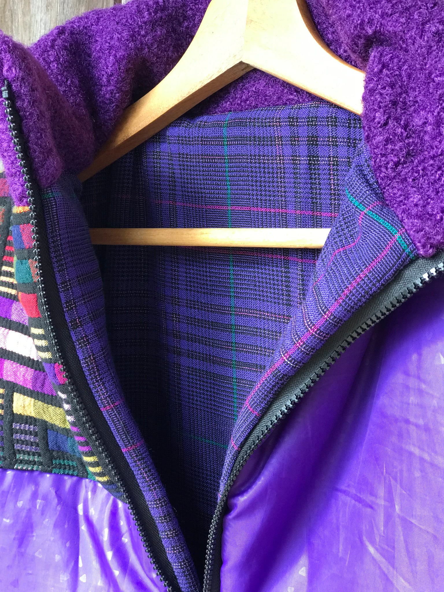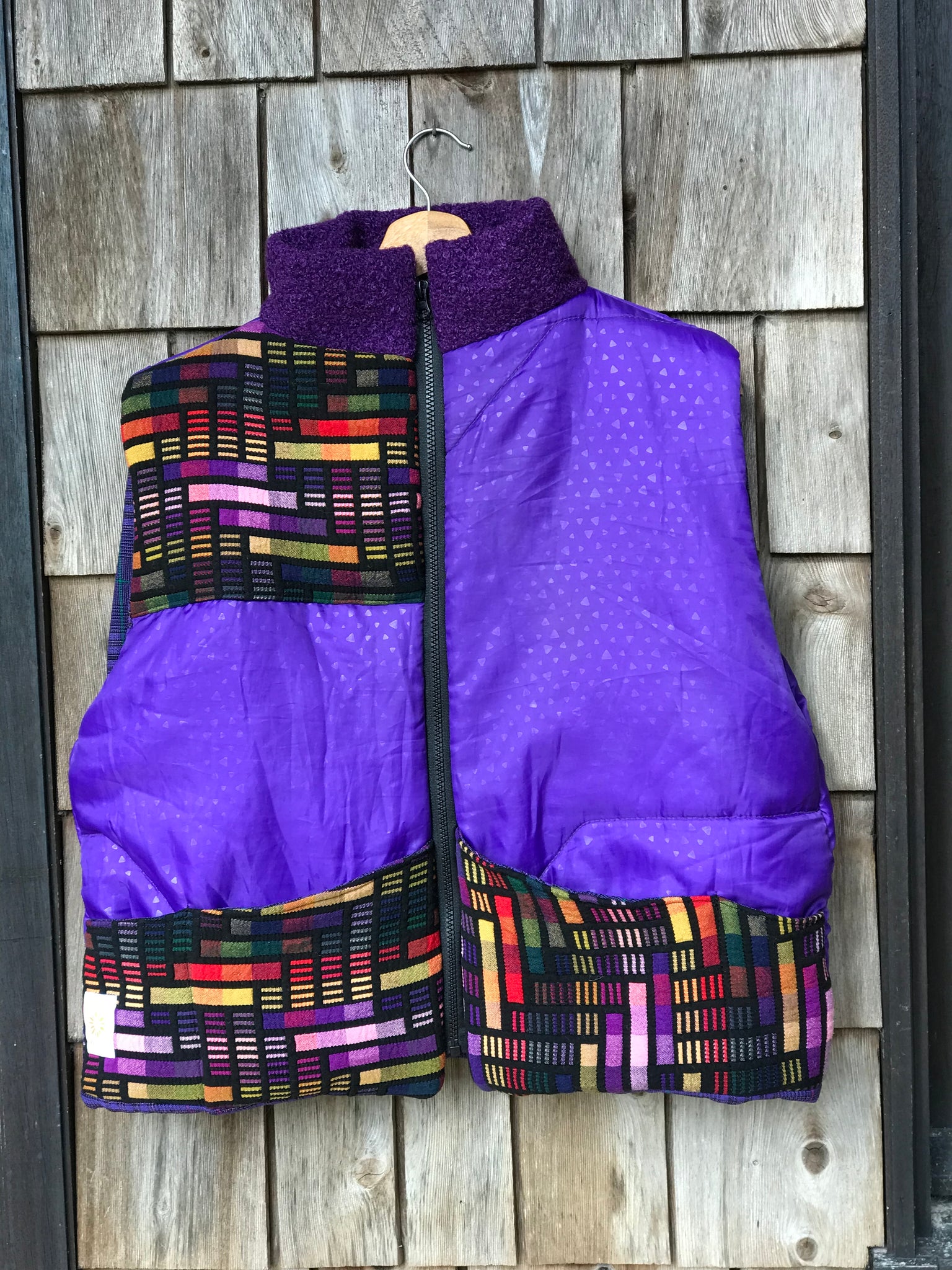 Gilet sans manche réalisé à partir de tissus vintage revalorisés. La partie violette était un duvet. Le tissu effet vitrail était un plaid vintage. Intérieur : tissu à carreaux vintage