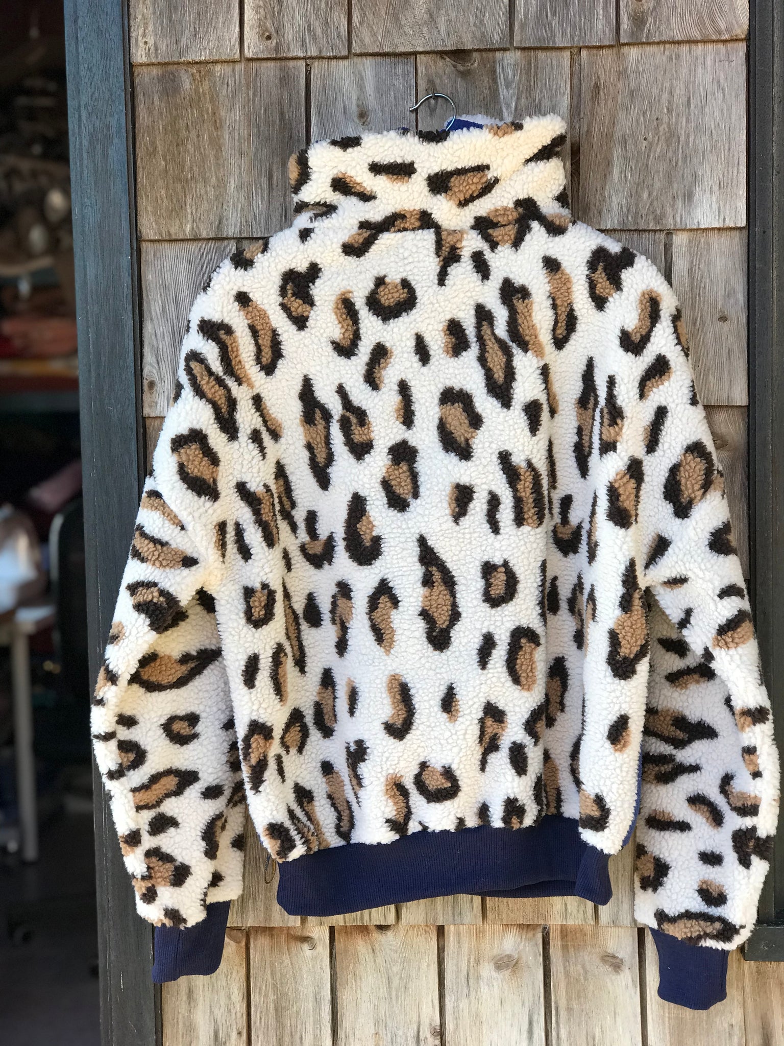 Pull à fermeture, col camionneur.Réalisé à partir de Sherpa léopard et couverture polaire bleue.