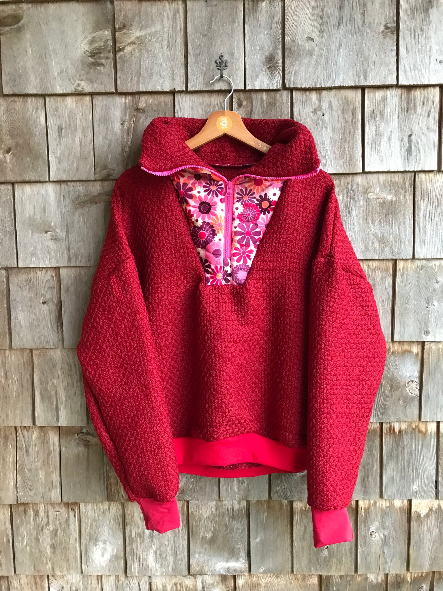 Pull Ă fermeture, col camionneur.RĂ©alisĂ© Ă partir dâun lainage chinĂ© et dâun tissu matelassĂ© fleuri đ