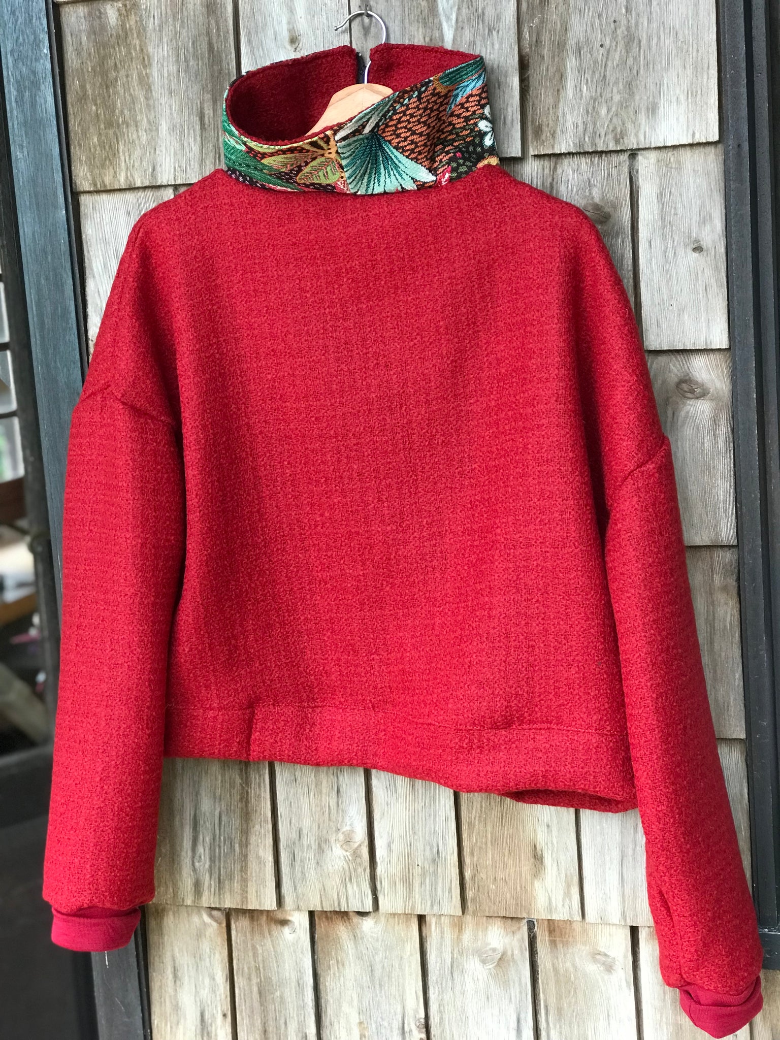 Pull à fermeture. Réalisé à partir de tissus vintage revalorisés /lainage et jacquard (pour le col )