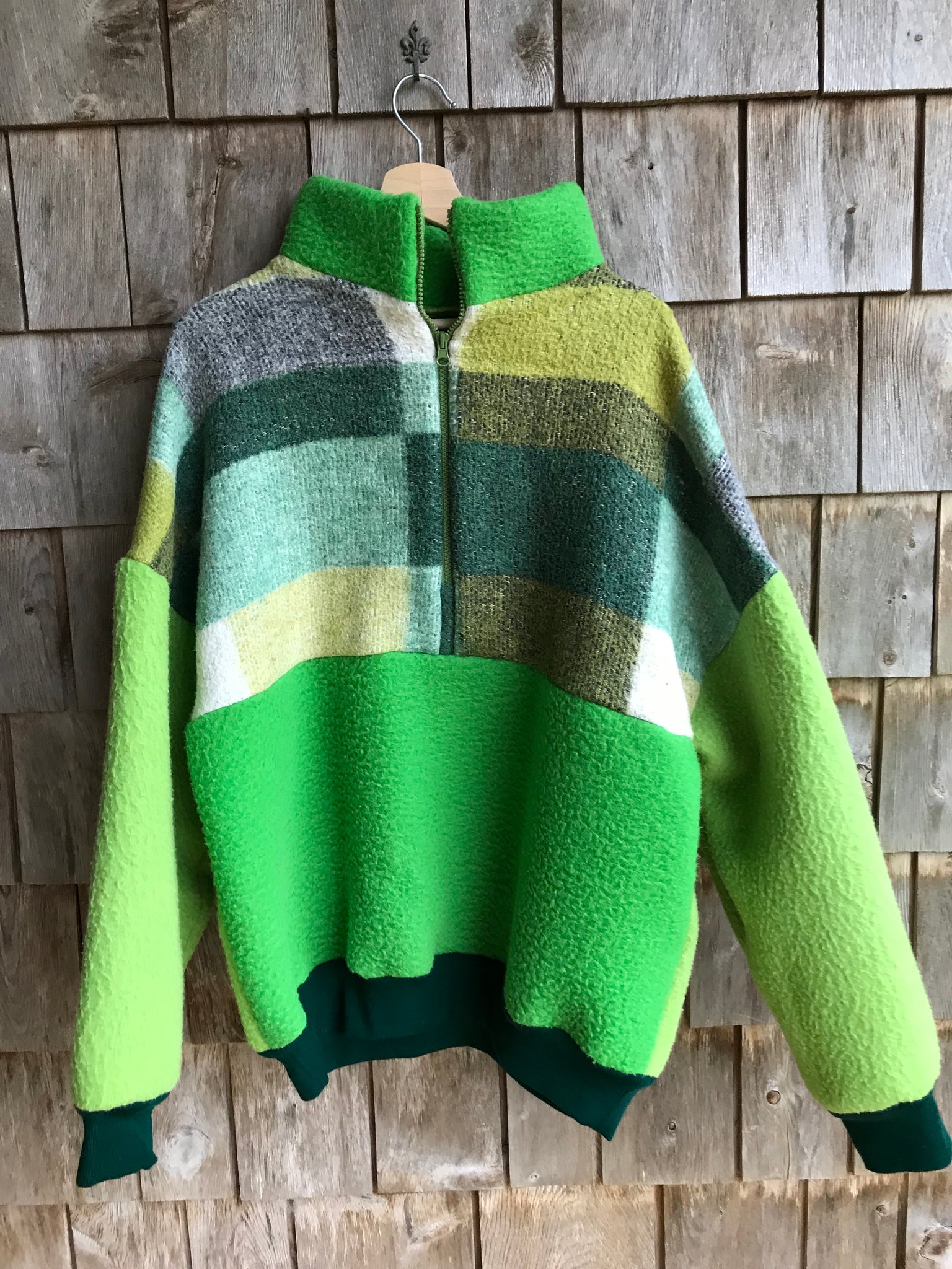 Pull à fermeture. Réalisé à partir de couvertures revalorisées